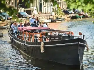 Anna Maria is the perfect boat for a large group canal tour. Up to 60 people can enjoy drinks at the bar and food varying from snack to exquisite diners. Of course this boat has a toilet, a heating and music on board. A great feature is the flexible roof, which allows for open air boating when the weather is nice.
