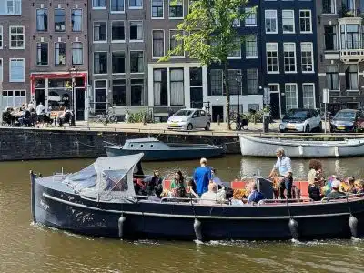 This large electric boat can take up to 25 people on a private 2 hour Amsterdam canal tour. It has cushions and a toilet on board and an English speaking skipper. You may bring your own snacks and drinks, or arrange these in advance with the boat operator. The roof can be removed if the weather is nice, and closed in case of rain.